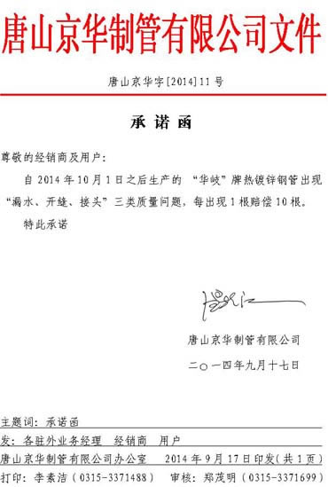 承诺函唐山京华字【2014】11号