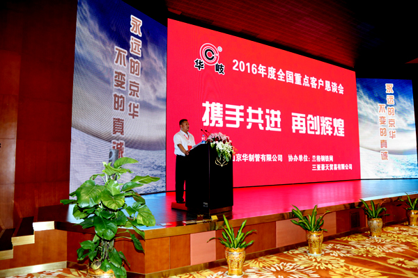 颁奖活动结束后,总经理温朝江作了题为《推进厂商交流,促进协作共赢,建立稳定健康和谐的合作关系》的重要讲话。他表示,唐山京华16年来经历了壮大发展、稳定发展、转型发展三个阶段,企业综合实力不断增强,实现了崭新的跨越。尤其是过去的五年,钢铁行业面临诸多不利因素,但唐山京华紧紧抓住战略机遇,坚持推进产品结构调整、产业升级的二次创业战略,提高了企业核心竞争力,在产品结构调整、成本管控、技术创新、市场开发等诸多方面也取得了全面进步。之后,他客观分析了钢管行业未来发展的三个趋势,一是钢管产品结构出现新的调整;二是工艺技术创新成为重要支撑;三是市场需求日益个性化、多样化。根据这些趋势,他指出,唐山京华未来五年发展规划将围绕深化产品结构调整,重点做好一个加法和一个减法。根据市场需求“做大总量,调整类别结构”,充分利用现有土地、资金、人力资源等的存量。围绕传统产品升级提质做加法,围绕低档次、低利润的产品、适度做减法,对接市场需求,形成合理优质、精品化的产品格局。