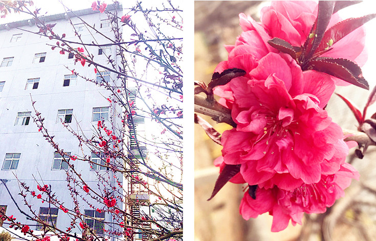 碧桃花娇俏鲜明,跳着春舞,仿佛在为职工们加油打气。