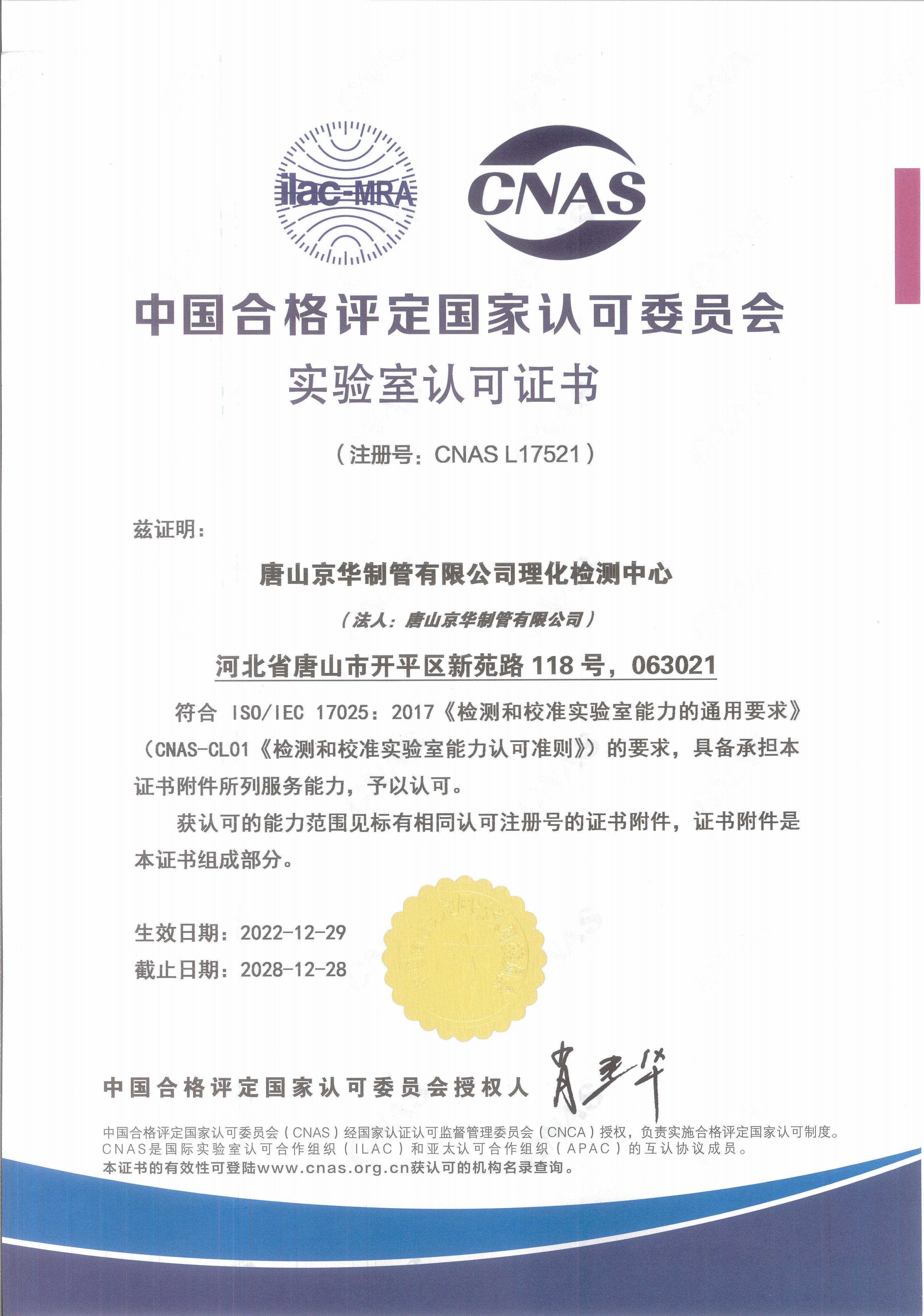 公司理化检测中心建筑面积800平方米,配置有专业的理化检测工程师多名,理化检测中心共分办公区、试验区,其中试验区包括物理性能检测试验区和化学检测试验区,拥有专业检验检测设备近百台。唐山京华理化检测中心CNAS认证的检测领域为金属材料及制品机械性能(拉伸试验、压扁试验、弯曲试验、冲击试验、硬度试验),碳素钢和中低合金钢化学元素分析、低压流体输送用焊接钢管的镀锌层重量测定、镀锌层均匀性试验、镀锌层附着力检验以及辅助材料的检验检测等多个检测项目。